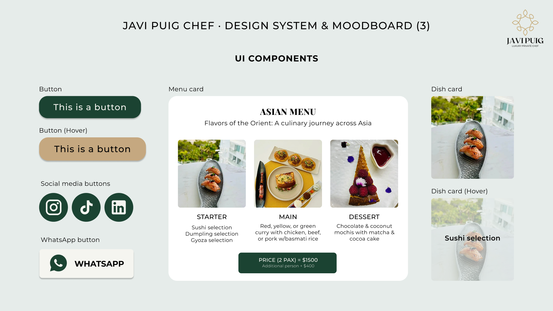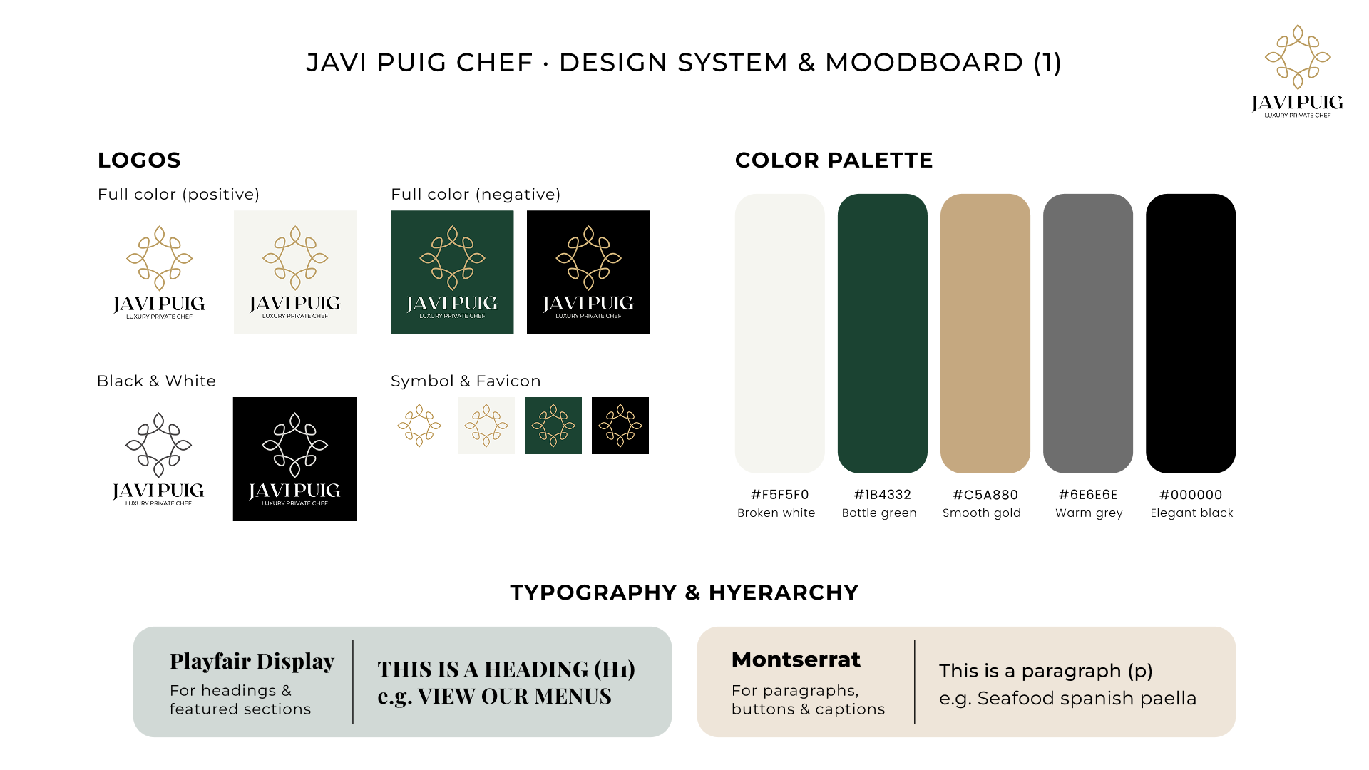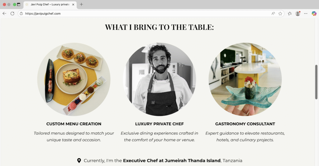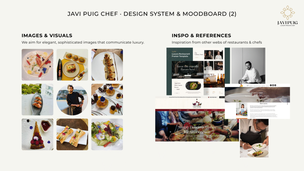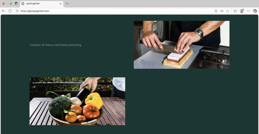 El proyecto consiste en acompañar a Javi, un chef privado de alta gastronomía, en la redefinición de su identidad digital y visual y la reconstrucción de su web. Para ello, trabajamos en el rediseño completo de su identidad corporativa (logotipo, paleta de colores y tipografías) con el objetivo de transmitir coherencia, exclusividad y cercanía.
